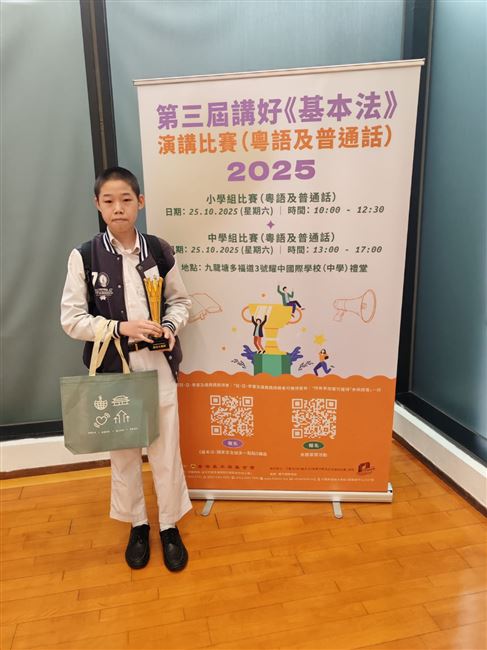 To enhance students' understanding and support of the Constitution of the People's Republic of China and the Basic Law, our students participated in the 3rd "Promoting the Basic Law" Speech Contest. Yang Qicheng from Class 3A was awarded the “Best Stage Presence Award” in the Secondary School Putonghua category.